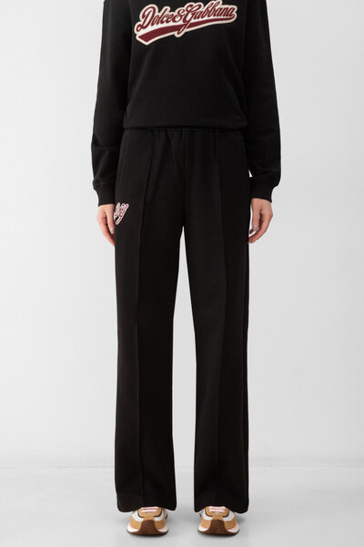 Чёрные брюки Dolce&Gabbana с простроченными стрелками. Для изготовления изделия с двумя врезными карманами с листочкой по бокам используется хлопковый трикотаж. Оптимальную посадку модели по линии талии обеспечивает широкий эластичный пояс-резинка. Атрибутом Дома является двухцветная дизайнерская аббревиатура «DG», вышитая спереди справа. Созайте органичный комплект, сочетая брюки в спортивном стиле с парным свитшотом со спущенной линией плечевого шва из той же коллекции.