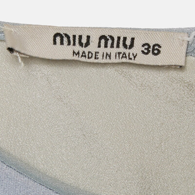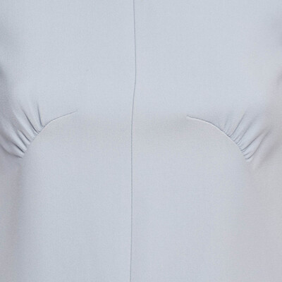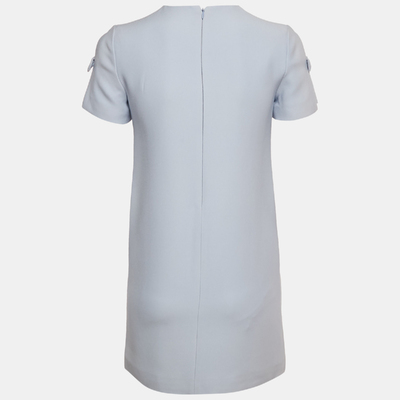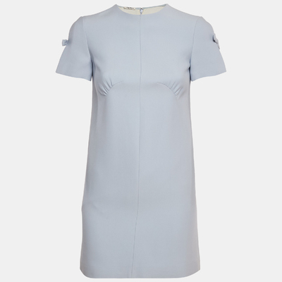 This authentic Miu Miu dress brings together charm and simplicity. Crafted from smooth blue crepe, it features subtle sleeve cut outs finished with small bows and gentle gathering at the bust.