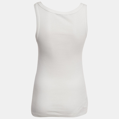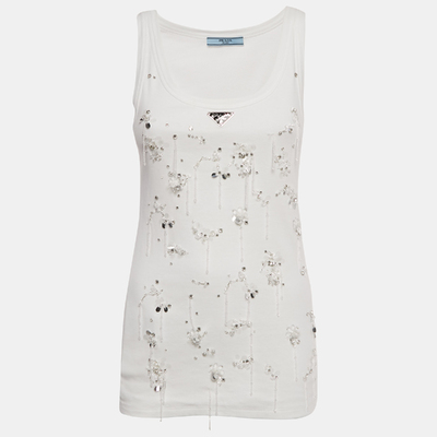 This pre loved Prada tank top is crafted from soft white cotton jersey and features the brand logo plus light embellishments on the front. Its easy fit and breathable fabric make it ideal for layering or wearing on its own.