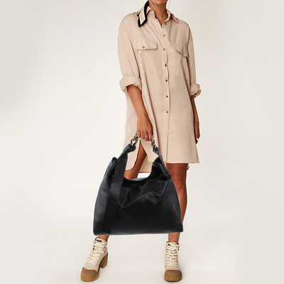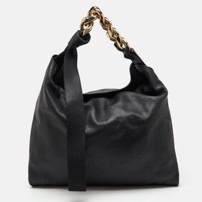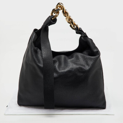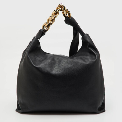 A modern icon, J.W. Anderson’s large hobo stands out for its bold sculptural chain handle — instantly recognizable yet endlessly wearable. Crafted from smooth black leather, its slouchy structure offers relaxed sophistication. The oversized silhouette merges utility with contemporary artistry, a reflection of the brand’s architectural approach to accessories. Pair with fluid knits or minimalist separates for directional polish.