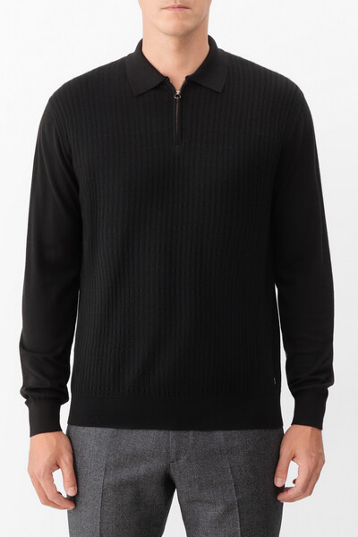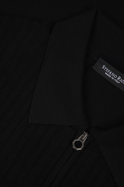 Поло Stefano Ricci станет неотъемлемой частью вашего повседневного гардероба. Для изготовления модели с вертикальным геометрическим узором в виде полос спереди выбран мягкий трикотаж на основе шерсти virgin, гладкого шёлка и кашемира. Изделие чёрного цвета комфортно садится по фигуре благодаря широкому эластичному поясу и манжетам-резинкам.