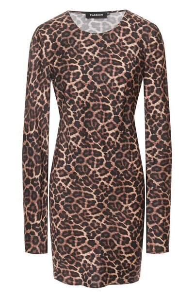 Приталенное мини-платье со слегка расклешенным подолом выполнили из вискозы с леопардовым узором. Наши стилисты предлагают дополнить образ мюлями и сумкой.