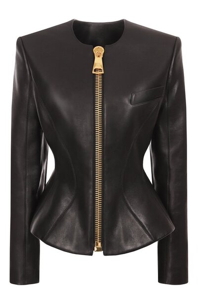 Короткую приталенную куртку с цельнокроеной баской выполнили из кожи ягненка. Модель с нагрудным карманом застегивается акцентной молнией с крупным брендированным пуллером.