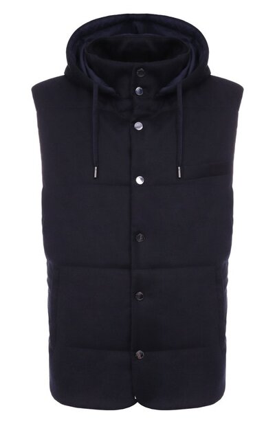 Стеганый жилет с воротником-стойкой сшили из комбинации непродуваемого полиэстера и фланели из шерсти мериноса. Модель со съемным регулируемым капюшоном и тремя врезными карманами застегивается брендированными кнопками.