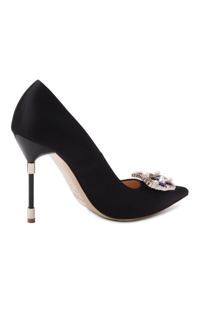 Туфли Decollete Tutti Frutti 105 с зауженным мысом сшили из атласа, а для подклада и подошвы использовали кожу. Модель с металлическими наконечниками на высокой шпильке украсили фигурной пряжкой с разноцветными кристаллами и перламутровыми бусинами.