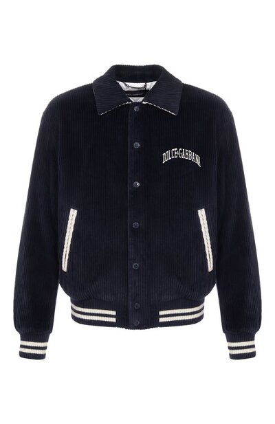 Бомбер, украшенный контрастным логотипом спереди и сзади, сшили из хлопкового вельвет-корда. Из такого же контрастного материала выполнили изнанку отложного воротника и отделку боковых карманов, которым вторят полосы на трикотажных манжетах и поясе.