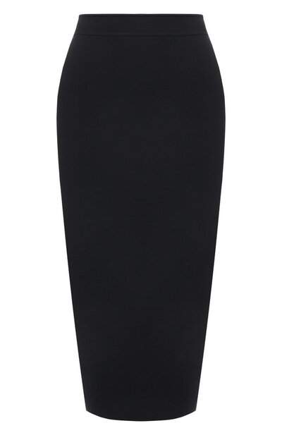 Юбку-карандаш со шлицей и широким поясом выполнили из шерстяного трикотажа. Эластичная модель без декора составит идеальный дуэт с парным жакетом.