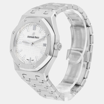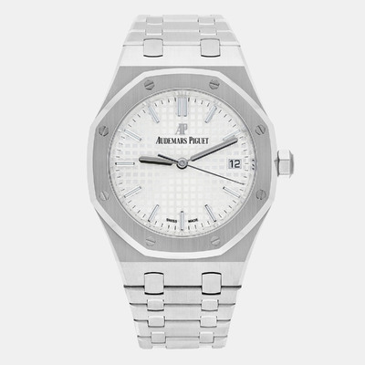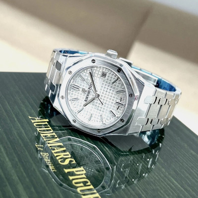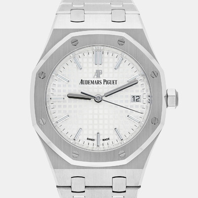 This Audemars Piguet Royal Oak features a 34mm stainless steel case with a matching bracelet and a bright silver tone dial. Its automatic movement offers dependable precision, while the signature octagonal bezel completes the classic Royal Oak design. A versatile women’s watch suited for daily wear.
