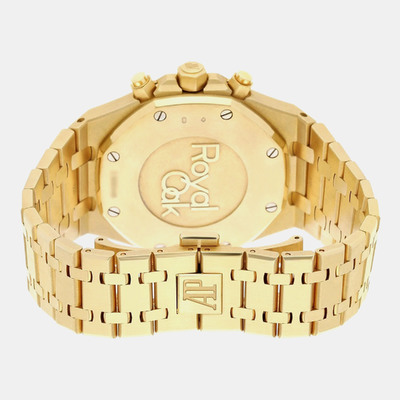 This 41mm Royal Oak pairs a blue dial with a full 18k yellow gold case and bracelet. The automatic movement keeps time with accuracy, while the signature “Grande Tapisserie” pattern adds visual depth. A distinguished men’s gold watch known for its craftsmanship and bold color contrast.