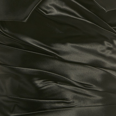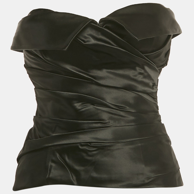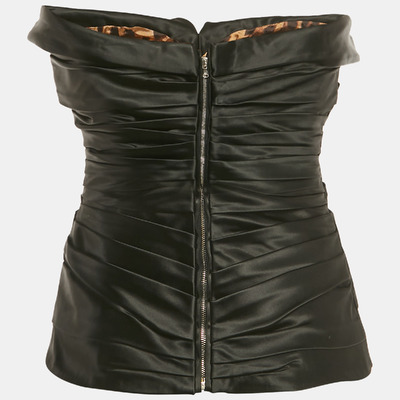 Exude sultry sophistication with this Dolce and Gabbana strapless corset top in lustrous black satin. Designed with ruched detailing to enhance the silhouette, it offers a sculpted and feminine fit. Perfect for evening styling or layering with sharp tailoring.