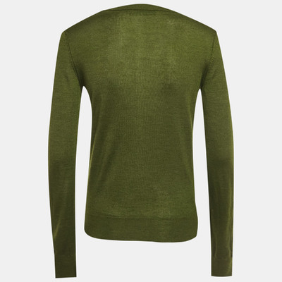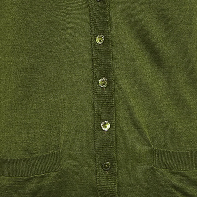 Dolce and Gabbana’s cardigan is rendered in an olive green wool blend with a fitted silhouette. Finely ribbed textures and tonal buttons create dimension while maintaining a sleek line. A versatile layering piece that reflects the label’s approach to modern femininity with Italian craftsmanship at its core.