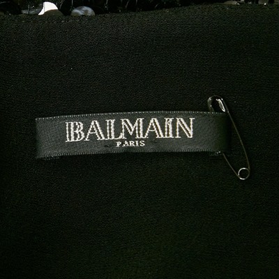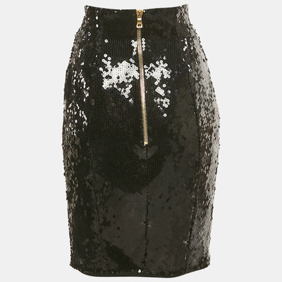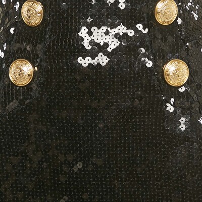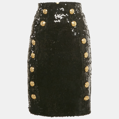Command attention with this Balmain mini skirt adorned in dazzling black sequins and signature embossed gold tone buttons. Its fitted silhouette exudes bold luxury, ideal for evening parties or statement occasions. Pair with a sleek blouse for instant runway appeal.