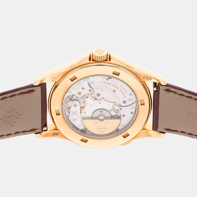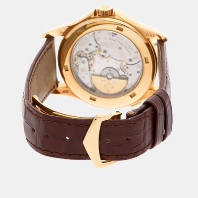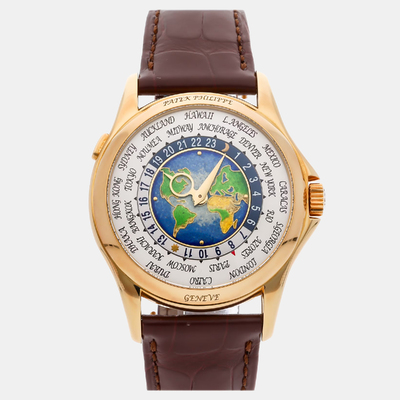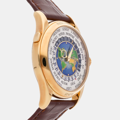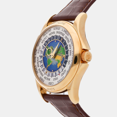 The Patek Philippe World Time 5131J 001 features a stunning world map dial within a 39 mm 18k yellow gold case, showcasing the brand’s mastery of intricate Swiss craftsmanship. This pre owned automatic men’s wristwatch combines technical excellence with global elegance, making it a coveted statement piece for luxury collectors.