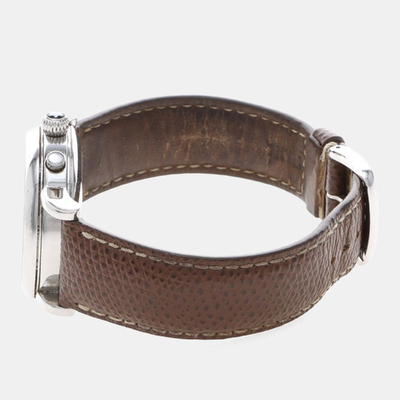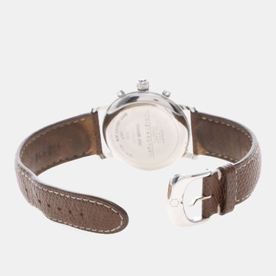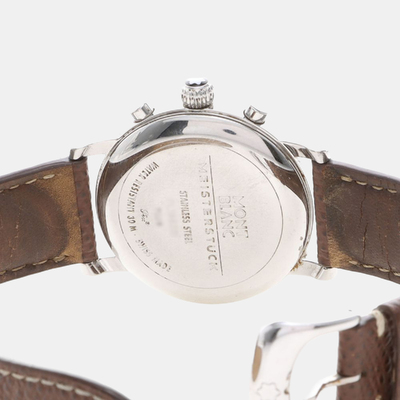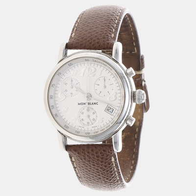 The Montblanc Star Chronograph 7038 features a 39mm stainless steel case with a clean white dial and automatic movement. Chronograph functions and a date display add to its everyday practicality. A well balanced choice for men seeking a reliable, classic style timepiece.