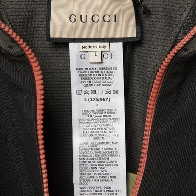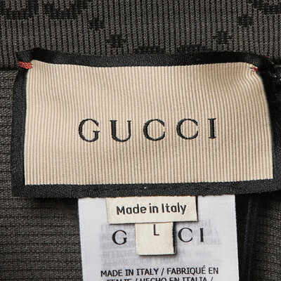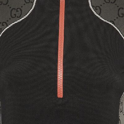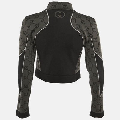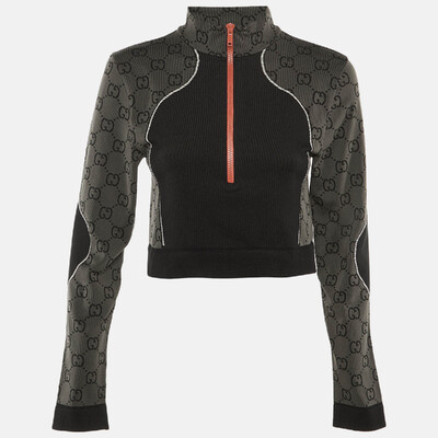This Gucci cropped top balances sporty structure with unmissable branding. The body is set in black, while the long sleeves are in grey GG jacquard. A half zip front and raised neck give it a jacket like feel, and the cropped length keeps the look modern.