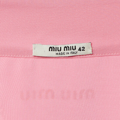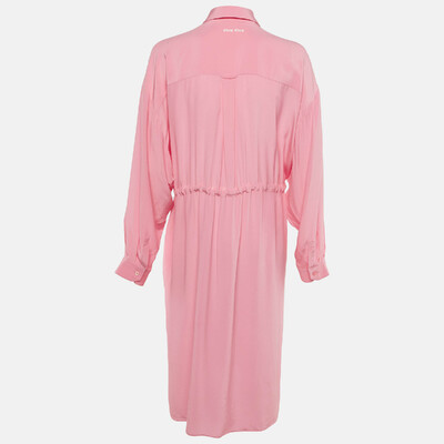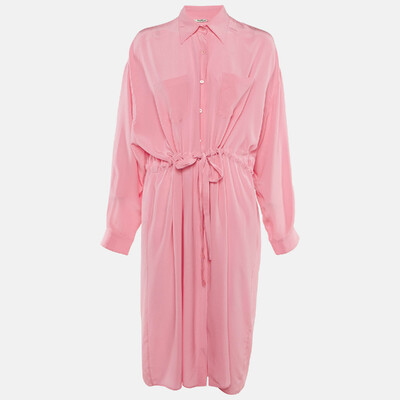 Miu Miu’s silk midi dress captures the house’s playful femininity. Rendered in blush pink, it’s detailed with a button front closure, subtle gathers, and a gently flared skirt that moves fluidly. The lightweight silk construction adds luster and ease. Perfect for brunches or soirées, it pairs beautifully with understated jewelry and classic pumps.