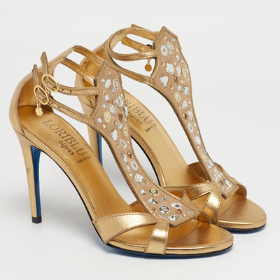 Loriblu’s gold leather sandals are shaped with a high stiletto heel and detailed front panels set with faceted crystals. The ankle strap adds structure to the shimmer, creating a design that feels glamorous and unmistakably designer.