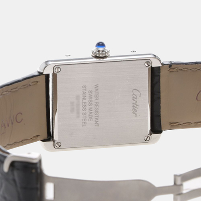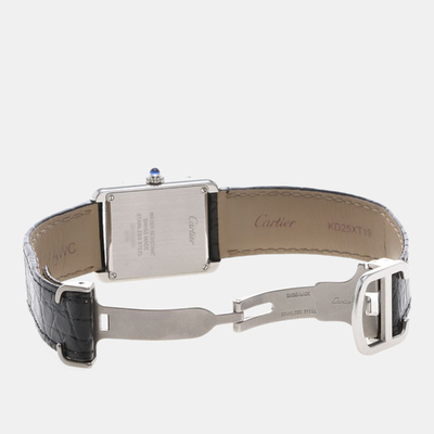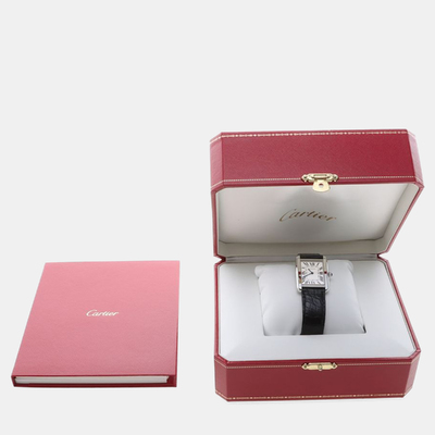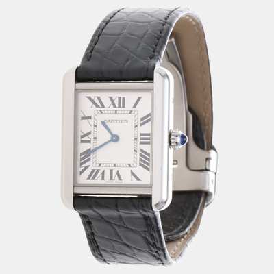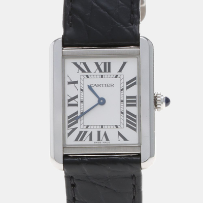 The Cartier Tank Solo W5200005 is a compact 24.5mm stainless steel women’s wristwatch with a white dial and Roman numeral markers. Its quartz movement ensures consistent accuracy, and the clean rectangular design reflects Cartier’s signature watchmaking style.