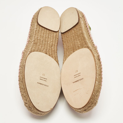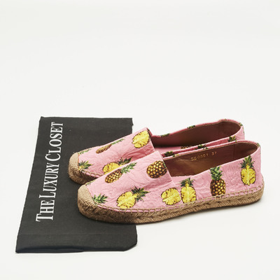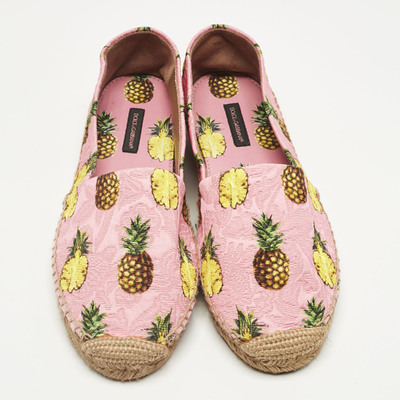 Bring vacation vibes to your wardrobe with these Dolce and Gabbana espadrilles featuring a playful pink and yellow pineapple brocade. Set on a classic jute sole, they blend Mediterranean charm with everyday comfort. A fun and fresh statement for sunny days.