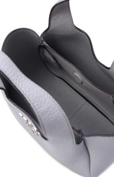 Сумку из зернистой телячьей кожи украсили фирменным треугольником с металлическим логотипом. Внутри аксессуара с двумя короткими ручками предусмотрели три отделения, дополнив центральное магнитной застежкой.