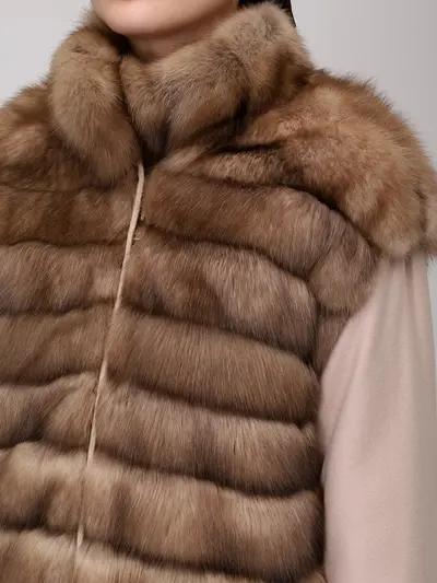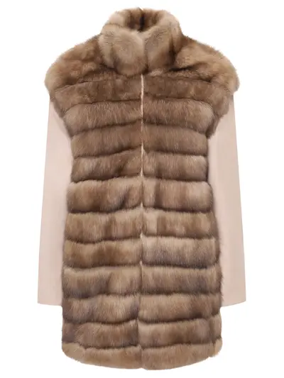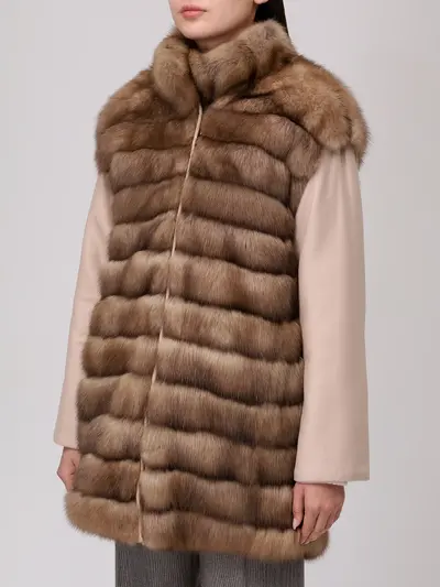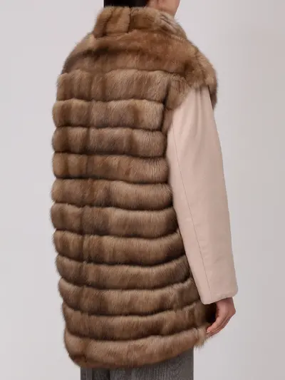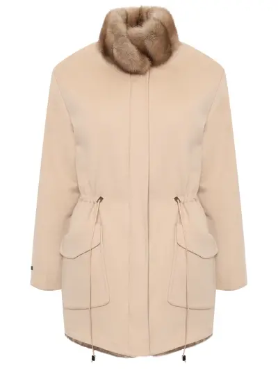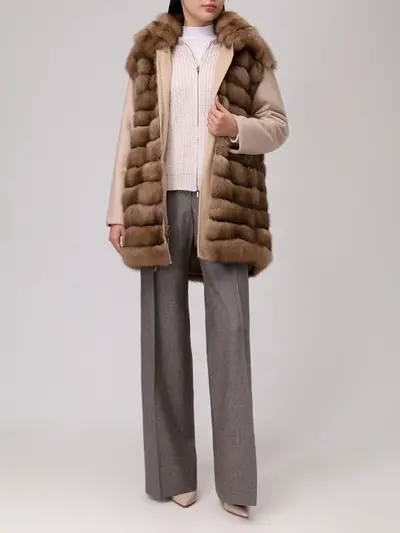 -Двусторонняя парка из мягкого смесового кашемира и натурального меха соболя от MANZONI24. -Модель свободного силуэта с длинными рукавами, кулиской на талии, глубокими карманами, воротником-стойкой, застежкой на молнию с двумя пуллерами.