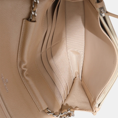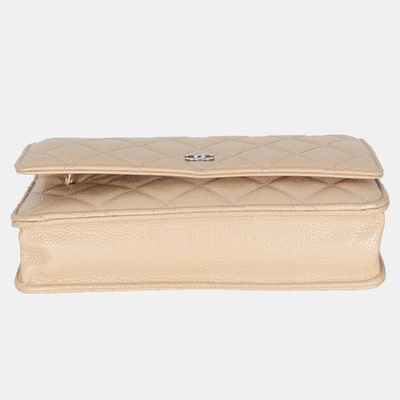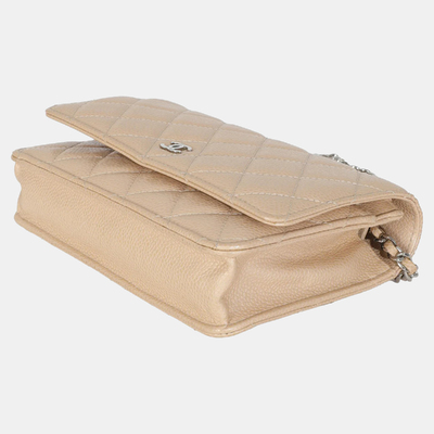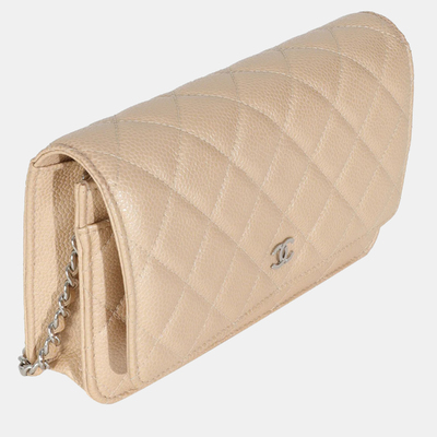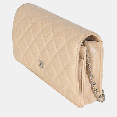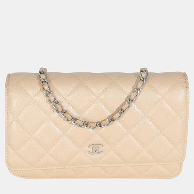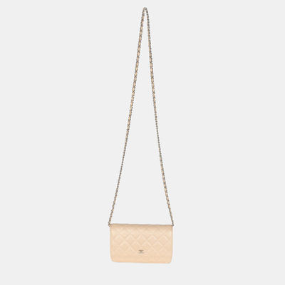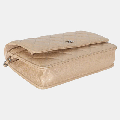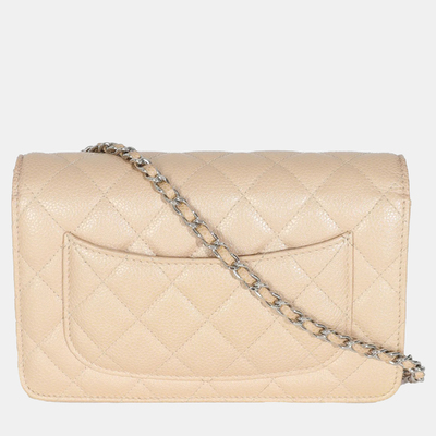 Iconic in proportion and eternally Parisian, this Chanel Wallet on Chain from the 15C collection is crafted in quilted beige caviar leather—a tactile canvas for understated luxury. Lightweight yet instantly recognizable, it transitions effortlessly from day to evening with that signature Chanel ease.