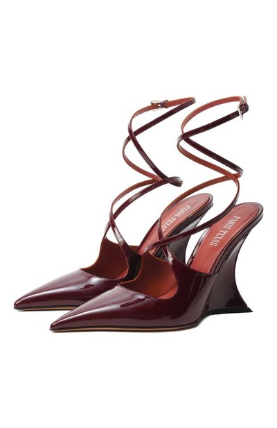Туфли Nina на высокой скульптурной танкетке выполнили из гладкой лакированной кожи. Модель с зауженным мысом застегивается на пряжку ремешками, перекрещивающимися на подъеме и дважды обвивающими щиколотку.