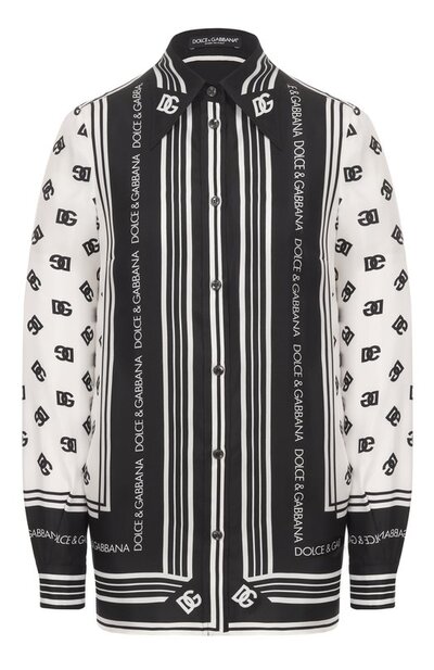 Блузку с контрастным принтом DG по всей поверхности выполнили из шелкового твила. Свободная модель с острым воротником и бантовой складкой сзади, как и прямоугольные манжеты, застегивается пуговицами.