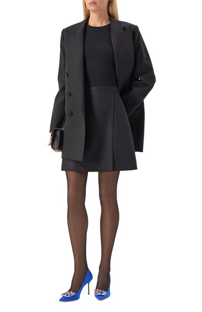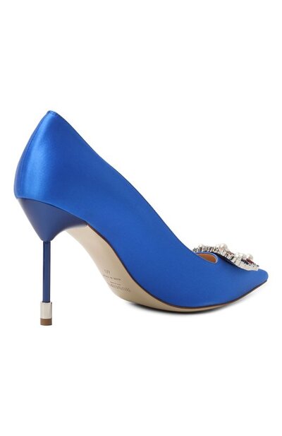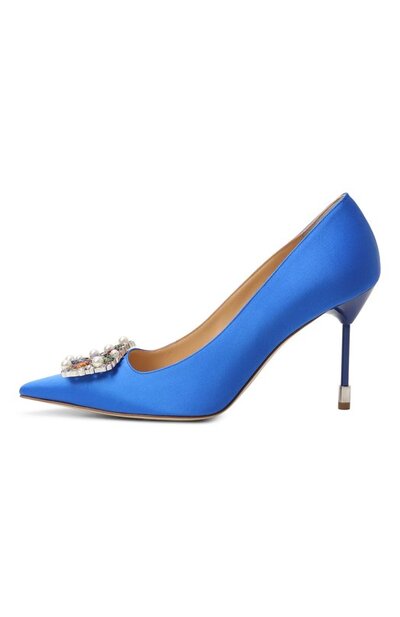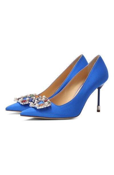 Туфли Tutti Frutti с металлическим цилиндром на высокой шпильке украсили фигурной пряжкой с разноцветными кристаллами и перламутровыми бусинами. Модель изготовили из атласа, укрепив пару изнутри мягкой кожей.