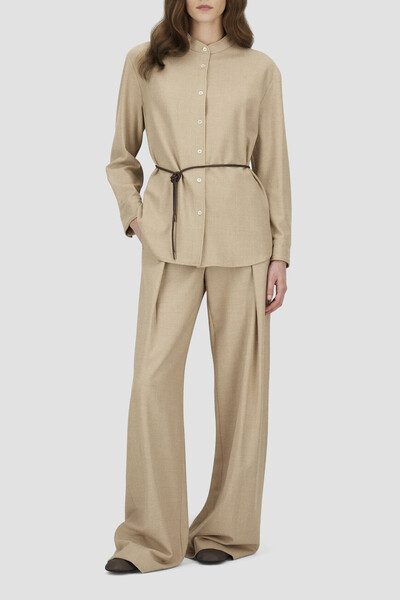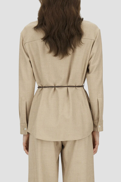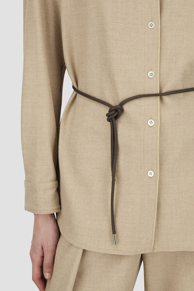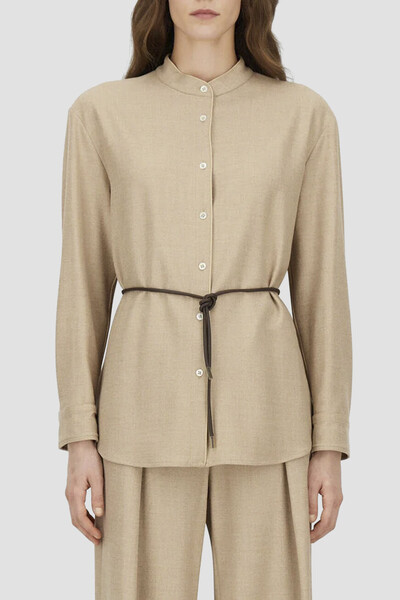 Переливающаяся на солнце блуза с укороченными рукавами от HERNO. Изделие прямого силуэта выполнено из мягкой шерсти с добавлением люрексовых нитей и текстурированным би-стрейч переплетением. Фасон модели характеризуется наличием невысокого воротника-стойки и застёжки на перламутровые пуговицы. В комплекте - кожаный ремешок на завязках с металлическими наконечниками.