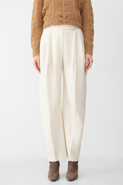 Стрейчевые брюки палаццо от Herno. Для производства изделия широкого силуэта oversize используется габардин на основе мягкой шерсти, прочного полиэфира и вискозного волокна. Модель белого цвета отличается струящейся текстурой и наличием вытачек-защипов спереди. В роли знакового для бренда декора выступает минималистичный лейбл с гравировкой на подвеске.