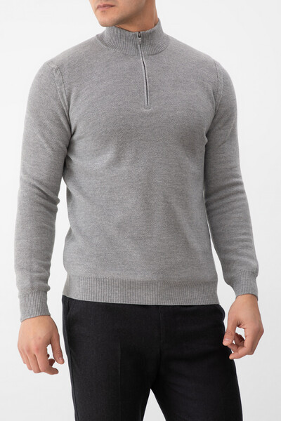Вязаный джемпер серого цвета от CORNELIANI. Для производства изделия прилегающего силуэта используется вирджинская шерсть. Фасон повседневной модели характеризуется наличием воротника-стойки с застёжкой на короткую молнию в верхней части. Оптимальную посадку джемпера по фигуре обеспечивают широкий эластичный пояс и манжеты-резинки.