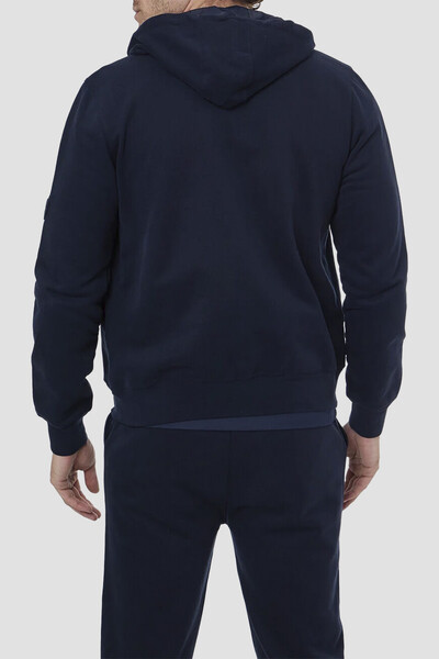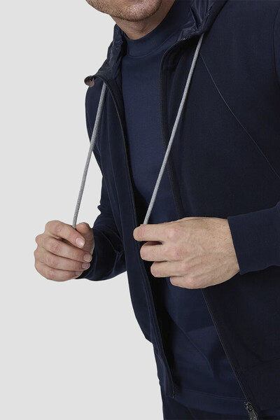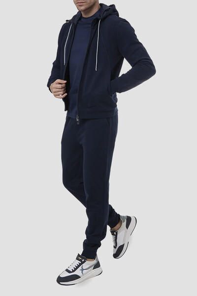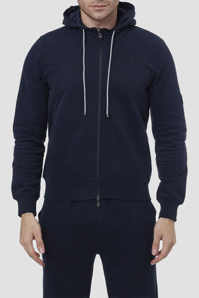 Толстовка CORNELIANI на встречной молнии с двумя брендированными пуллерами. Модель изготовлена из мягкого хлопкового трикотажа глубокого синего оттенка. Глубокий капюшон на светло-серых завязках обеспечивает надёжную защиту от холода и ветра, а манжеты рукавов и широкий эластичный пояс - оптимальную посадку изделия по фигуре. Толстовку можно носить в комплекте с парными брюками на резинке из той же коллекции.