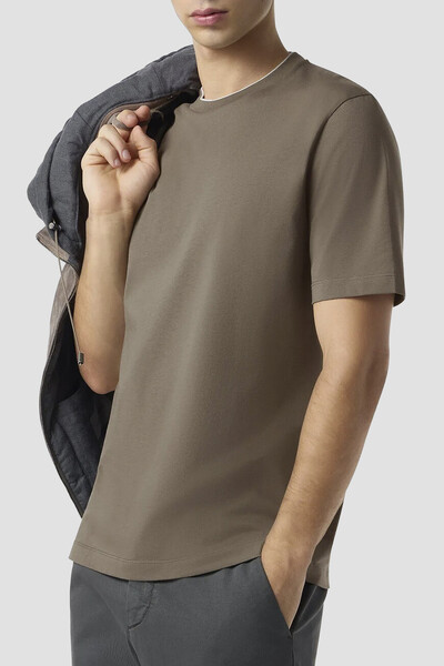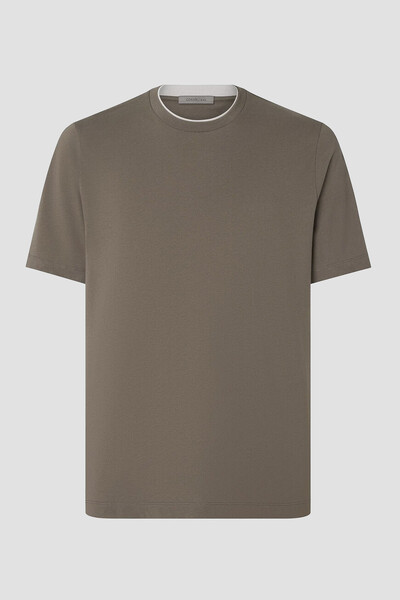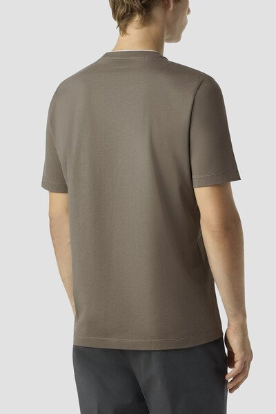 Футболка Corneliani станет основой лаконичного, но изысканного комплекта. Для пошива повседневной модели используется плотный хлопковый трикотаж, структура которого обеспечивают безупречную посадку изделия по фигуре. В роли знакового для бренда декора выступает надпись-логотип, расположенная на спинке под воротником. Круглый вырез горловины украшает белая деталь-полоса, создающая на поверхности двухслойный эффект наложения.