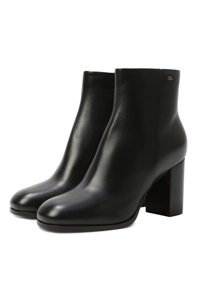 Ботильоны с подошвой фирменного оранжевого оттенка Arancio Santoni и на высоком блочном каблуке выполнили из гладкой кожи. Модель с литерой S на голенище и боковой молнией окрасили в готовом виде, чтобы получить патину.