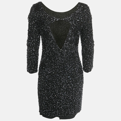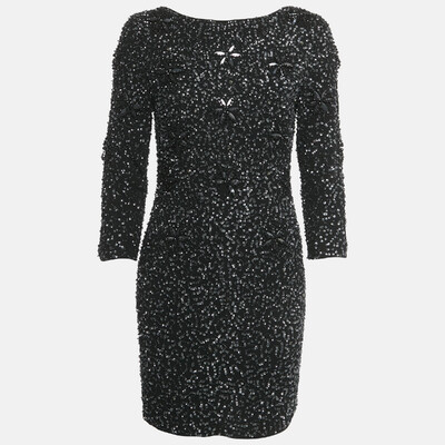 This Armani Collezioni mini dress combines sleek black crepe with subtle embellishments for refined glamour. The tailored silhouette flatters effortlessly while maintaining a polished finish. Ideal for cocktail evenings or formal gatherings.