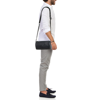 Dior’s Roller messenger bag fuses deep navy and black leather in a cylindrical shape. Whether commuting or exploring, the bag offers styling ease and luxe charm.