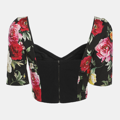 Embrace romantic flair with this Dolce and Gabbana Off Shoulder Cropped Top adorned in vibrant multicolor florals. Crafted from soft cotton, it offers a flattering fit with feminine charm. Pair it with high waisted skirts or denim for a statement summer look.