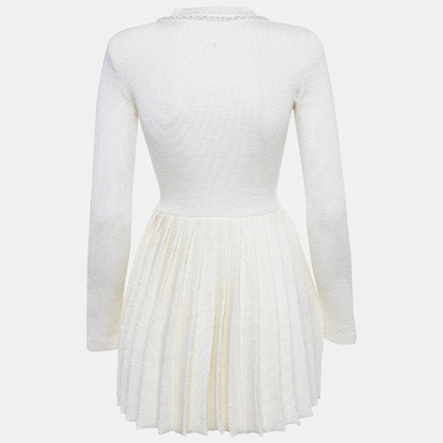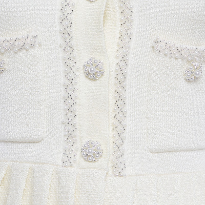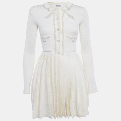 Soft cream waves ripple through this Self Portrait mini dress, where delicate pleats sway with every step. Long sleeves frame the arms gracefully, while faux pearls glimmer across the bodice. It’s a piece that feels as right for celebrations as it does for special evenings out.