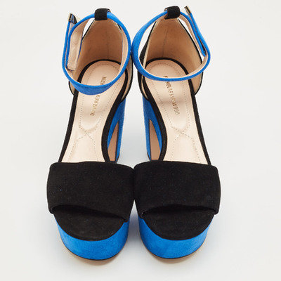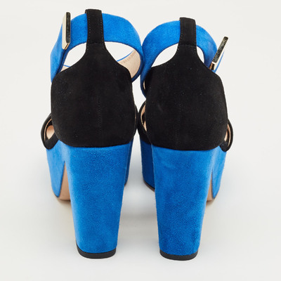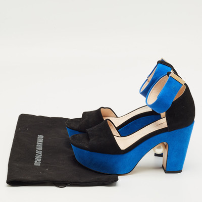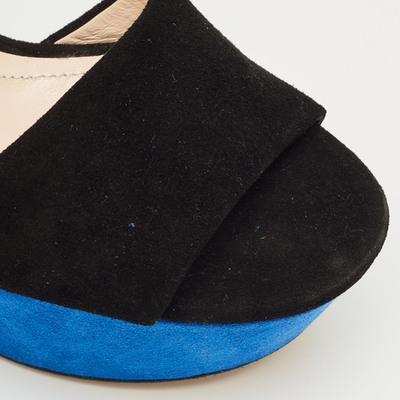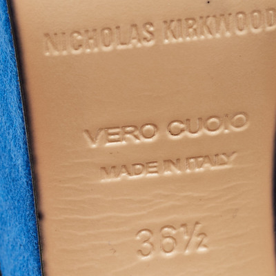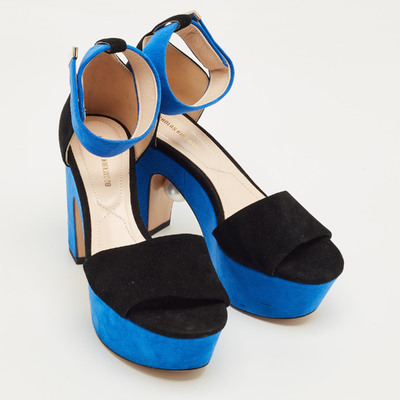 Nicholas Kirkwood’s sandals showcase sculptural glamour in contrasting black and blue suede. Set on a bold platform and slender stiletto heel, they feature a secure ankle strap and open toe design. A signature fusion of innovation and elegance, crafted for confident, elevated evening looks.