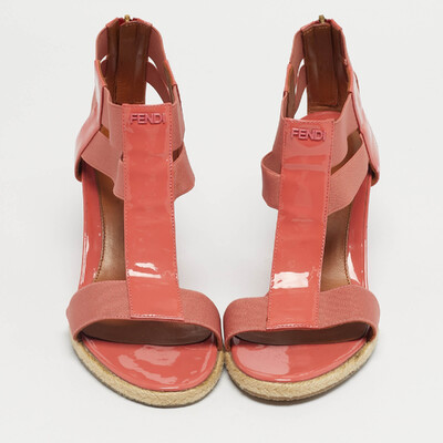 These Fendi espadrille wedges combine glossy coral patent leather with elastic fabric for a vibrant and comfortable fit. The T strap design and woven sole offer a playful yet chic warm weather look.