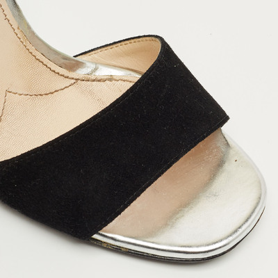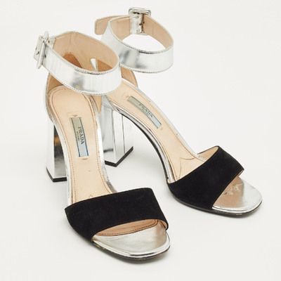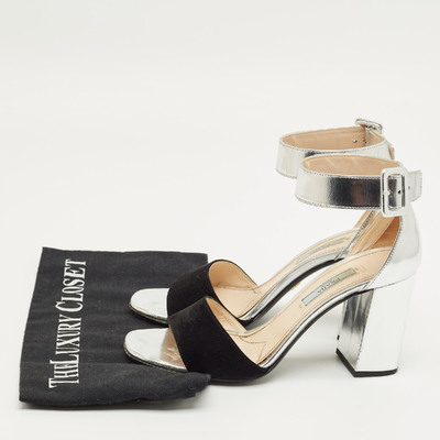 Prada turns simplicity into a statement with these silver and black sandals. Crafted in smooth patent leather and soft suede, the pair features a wide front strap balanced by block heels and secure ankle straps with silver tone buckles. Show them off with cropped hemlines.