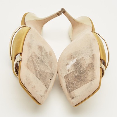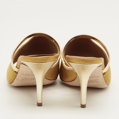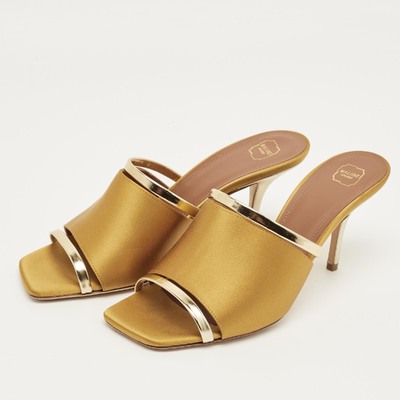 Malone Souliers’ Laney slides are handcrafted in Italy from metallic gold leather and mustard satin. The curved silhouette, open toe, and mid height heel blend comfort with sculptural grace. A modern design that transitions seamlessly from day gatherings to evening soirées.