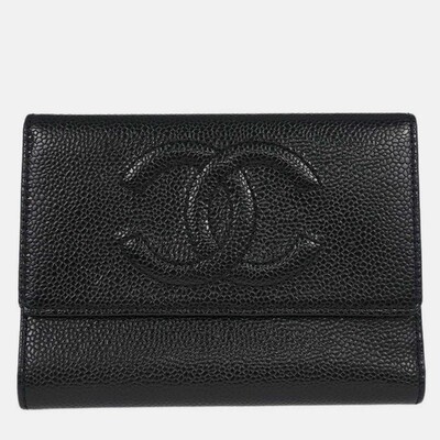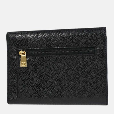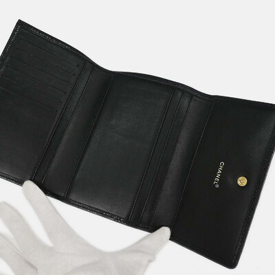 Crafted from smooth black calfskin leather, this Chanel trifold wallet offers functional design with signature CC detailing. Compact yet practical, it keeps essentials neatly organized.