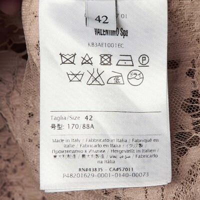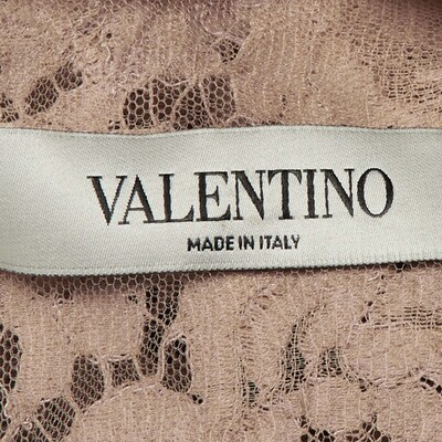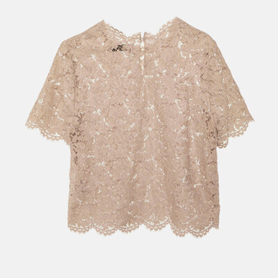 Valentino’s lace top channels delicate femininity through exquisite craftsmanship. Rendered in blush pink floral lace, it’s finished with scalloped edges that trace the neckline and cuffs. Lightweight and romantic, it pairs beautifully with tailored trousers or skirts for a polished day to night ensemble.