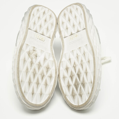 Crafted from white and silver leather, these pre owned Jimmy Choo womens sneakers catch light with every step. The sculpted sole gives them a bold shape, and the cushioned fit makes them as easy as they are striking.