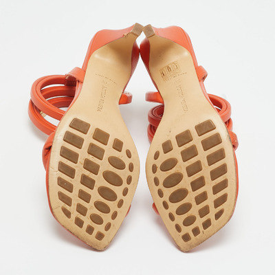 Bright and contemporary, these Bottega Veneta ankle wrap sandals are crafted from smooth orange leather. Featuring slim straps and impeccable construction, they capture the brand’s modern minimalist aesthetic. Perfect for adding a pop of color to summer ensembles.