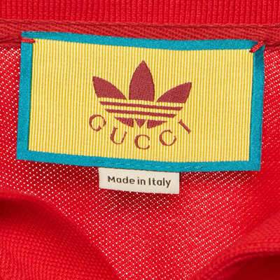 A rich red cotton pique forms this polo t shirt, updated with a Gucci x adidas logo. Its soft collar and short sleeves give it a casual feel, perfect for weekend layering or pairing with relaxed tailoring.