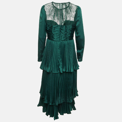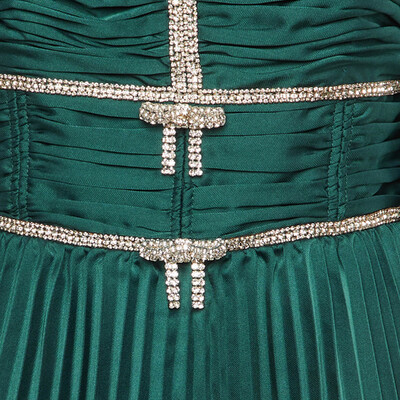 This Self Portrait dress brings together the label’s signature romance and modern flair. Made from glossy green satin, it features soft pleats through the skirt and a fitted bodice outlined with crystal trims that lend a hint of sparkle. The tiered design moves smoothly with every step, while the sheer yoke adds a delicate finish.