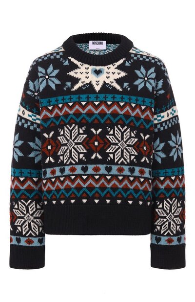 Свитер с жаккардовым норвежским узором украсили логотипом, выполненным в технике интарсии под круглой горловиной сзади. Модель со слегка спущенной линией плеч связали из шерсти мериноса.